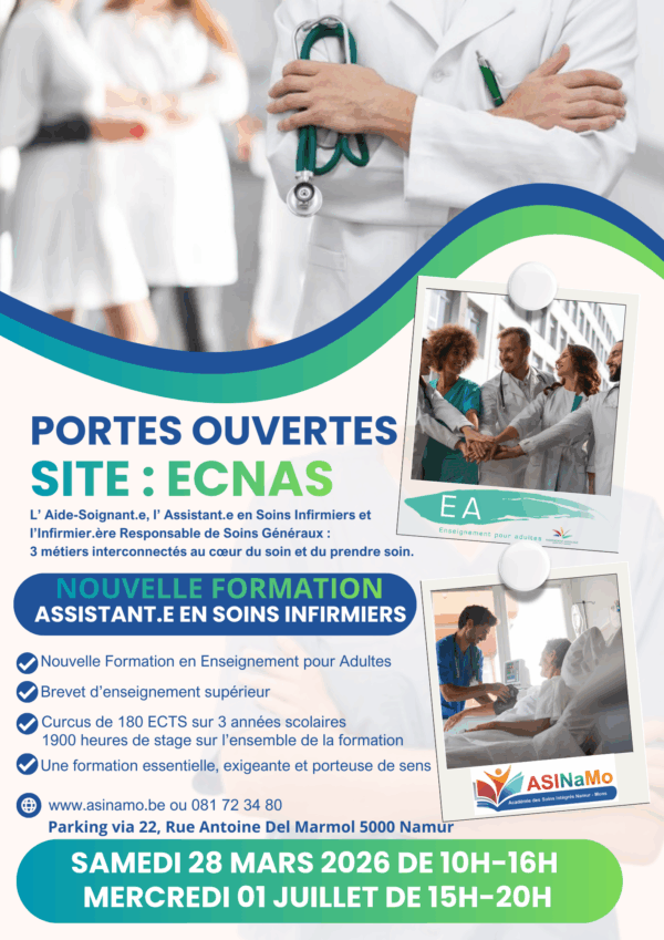 L’ASINaMo ECNAS Sainte-Elisabeth organise une formation d’Assitant.e en Soins Infirmier (AeSI) dans l’Enseignement pour Adultes, permettant aux apprenant.es d’obtenir un brevet d’enseignement supérieur.