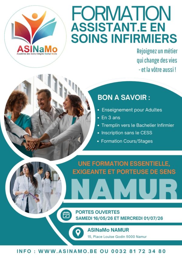 L’ASINaMo ECNAS Sainte-Elisabeth organise une formation d’Assitant.e en Soins Infirmier (AeSI) dans l’Enseignement pour Adultes, permettant aux apprenant.es d’obtenir un brevet d’enseignement supérieur.
